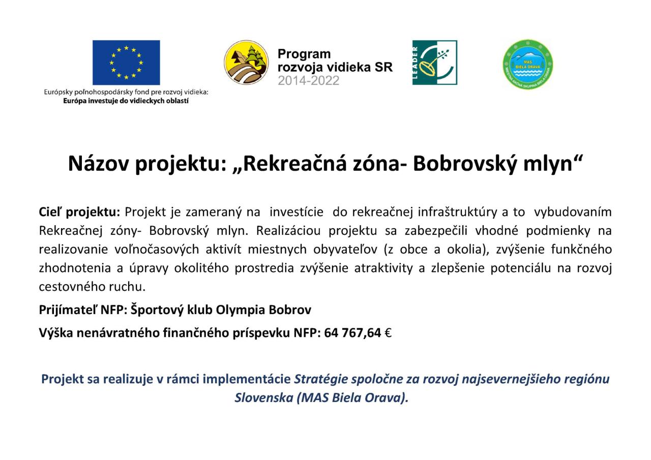 Projekt je zameraný na investície do rekreačnej infraštruktúry a to vybudovaním Rekreačnej zóny - Bobrovský mlyn. Realizáciou projektu sa zabezpečili vhodné podmienky na realizovanie voľnočasových aktivít miestnych obyvateľov (z obce a okolia), zvýšenie funkčného zhodnotenia a úpravy okolitého prostredia zvýšenie atraktivity a zlepšenie potenciálu na rozvoj cestovného ruchu.
