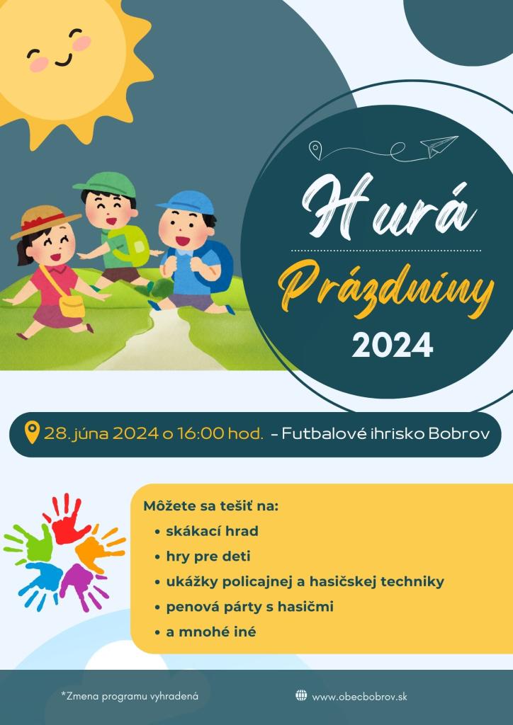 Stretneme sa v piatok 28. júna 2024 o 16tej hodine na futbalovom ihrisku v Bobrove. Budú na Vás čakať rôzne hry, skákací hrad, ukážky policajnej a hasičskej techniky, penová párty s hasičmi. Tešíme sa na Vás.