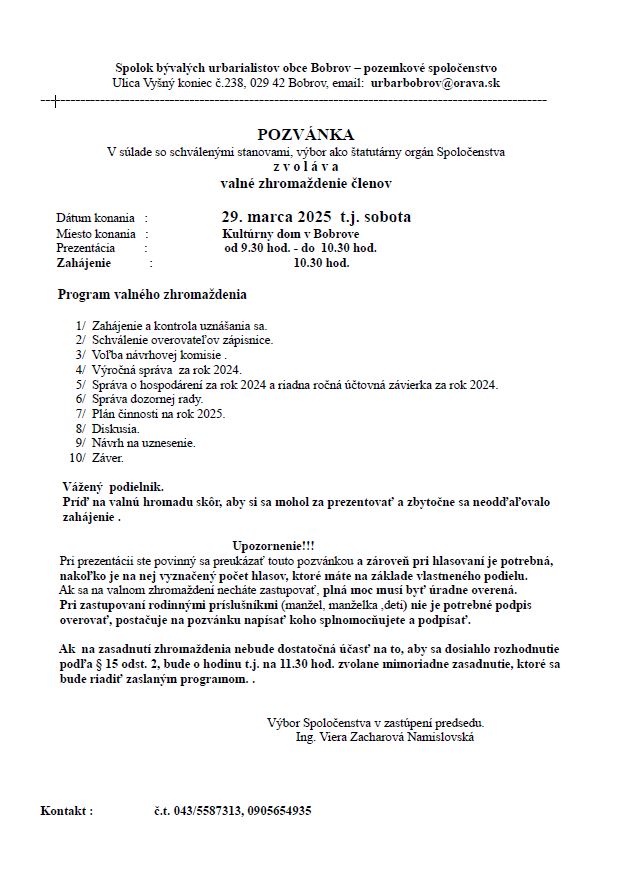 Pozvánka na valné zhromaždenie Spolku bývalých urbarialistov obce Bobrov, ktoré sa uskutoční 29. marca o 9:30 hod.
