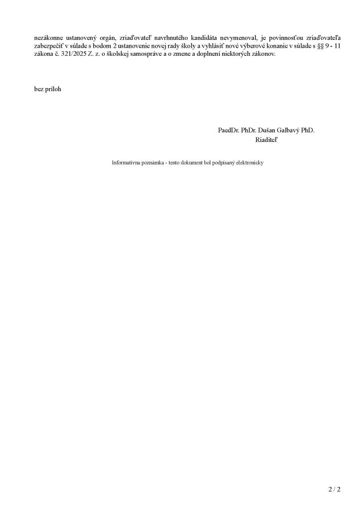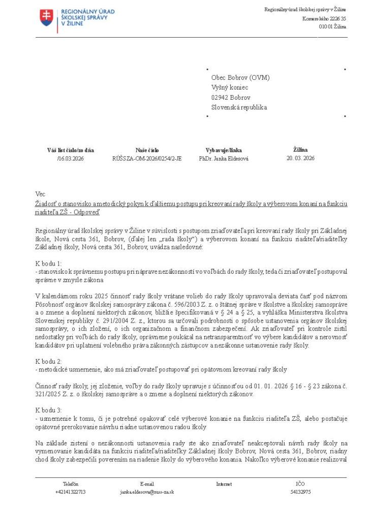 Po preverení dokumentov obec zistila nezrovnalosti vo voľbách do rady školy a postupovala v súlade so zákonom. Tento postup následne preskúmal aj Regionálny úrad školskej správy v Žiline, ktorý potvrdil, že obec postupovala správne a oprávnene poukázala na nezákonnosti vo voľbách.