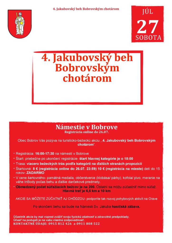 Obec Bobrov Vás pozýva na turisticko-bežeckú akciu ,,4. Jakubovský beh Bobrovským chotárom”.