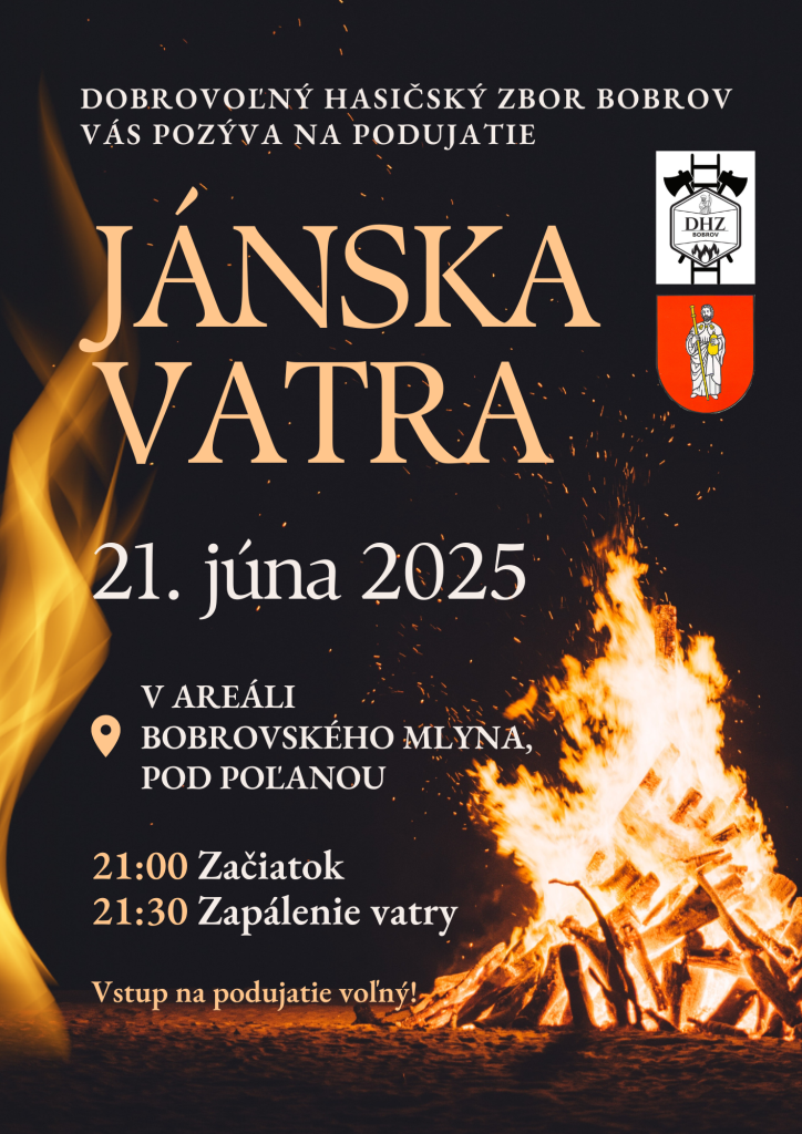 Dobrovoľný hasičský zbor Bobrov Vás pozýva v sobotu 21. júna 2025 na pálenie Jánskej vatry. Podujatie sa začne o 21:00 v areáli bobrovského mlyna, pod Poľanou. Vatra sa zapáli o 21:30.