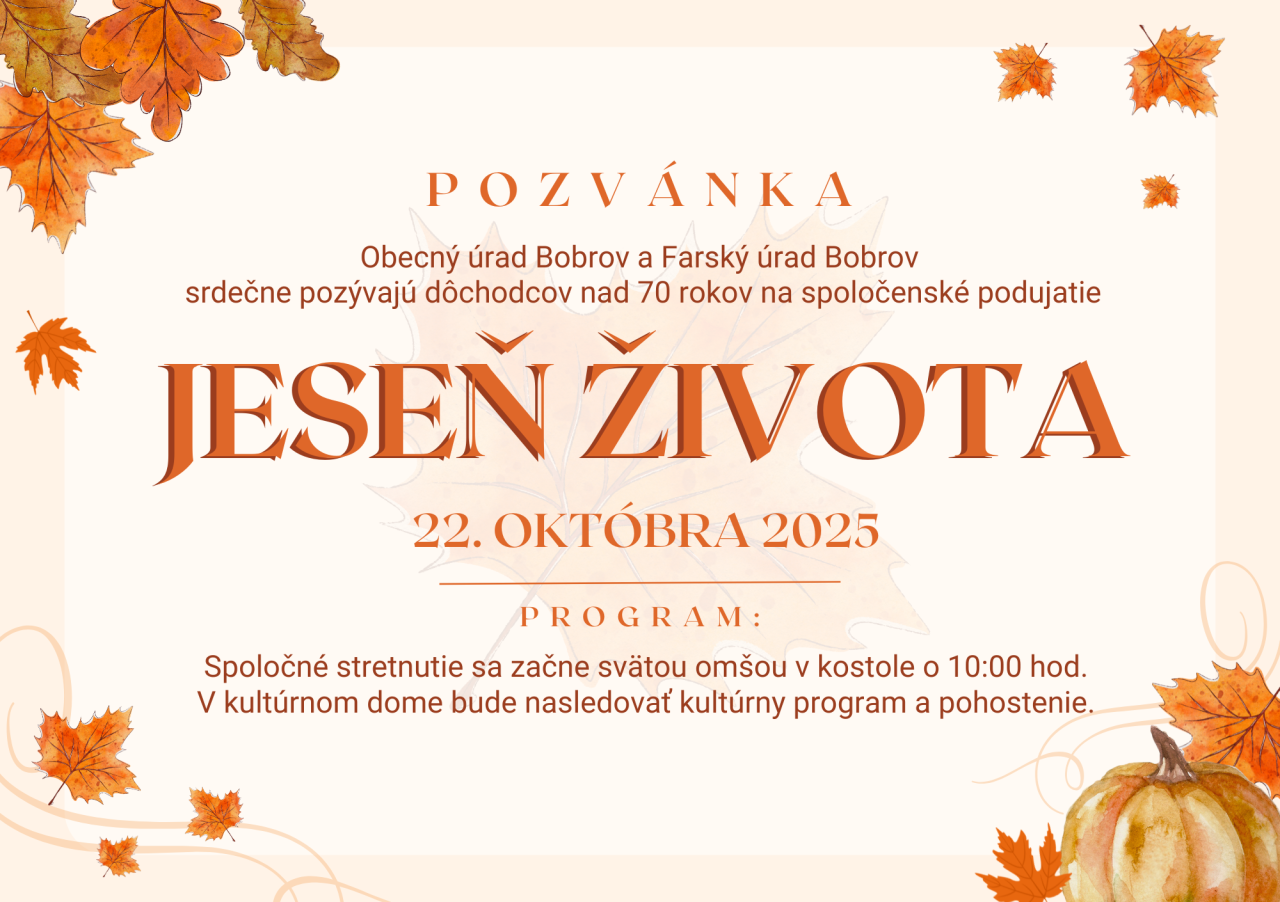 Obecný úrad Bobrov a Farský úrad Bobrov srdečne pozývajú dôchodcov nad 70 rokov na spoločenské podujatie JESEŇ ŽIVOTA, ktoré sa bude konať 22. októbra 2025.
